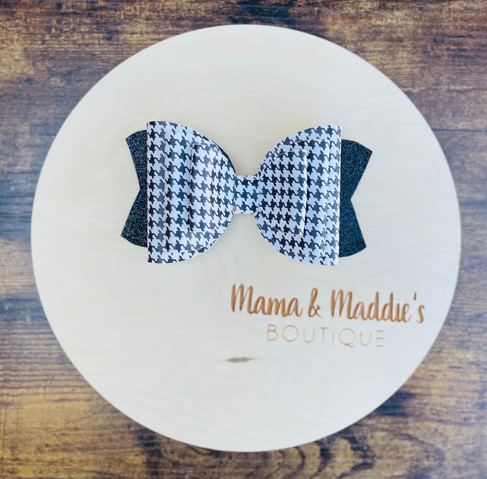 These faux leather hair bows can be put on an alligator clip, hair tie, barrette, or nylon headband. These bows range from 5" - 7"